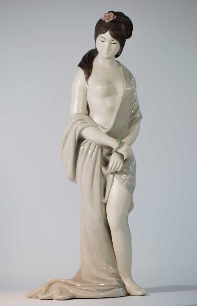 1. 单足支撑结构用“内部钢筋支架+胎泥分层塑型”;2. 裙摆以“拉坯法”塑出旋转的弧度,贴合腿部肌肉动态