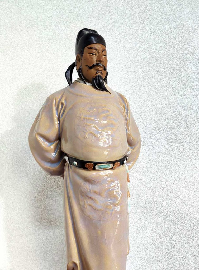庄稼深谙石湾陶塑“以静寓动”的传统,却以现代美学强化了“瞬间的戏剧性”:其《唐太宗》取李世民“抚剑凝思”的瞬间,剑柄的握持力度与微蹙的眉头形成张力,暗示“玄武门之变”后的复杂心境;而《桂酒献擎天》中,壮族青年敬酒的姿态并非静态的“献”,而是手臂微抬、酒碗倾侧的动态瞬间,使作品在静止中蕴含了动作的延续性。这种“宜起不宜止”的叙事手法,让雕塑成为“故事的切片”,拓展了作品的想象空间。