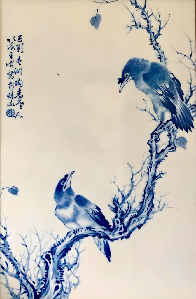 当青花料水在瓷胎上晕染出”墨分五色”的层次,当八大山人的孤绝笔意与景德镇的窑火相融,王步以”青花大王”之姿,完成了传统瓷绘向现代文人艺术的转型。其作品如本文所涉的禽鸟瓷板、人物笔筒,恰是这一转型的鲜活注脚——在蓝白交织的视觉韵律中,技法革新、意境拓展与载体突破,共同构建了20世纪中国陶瓷艺术的新高度。
