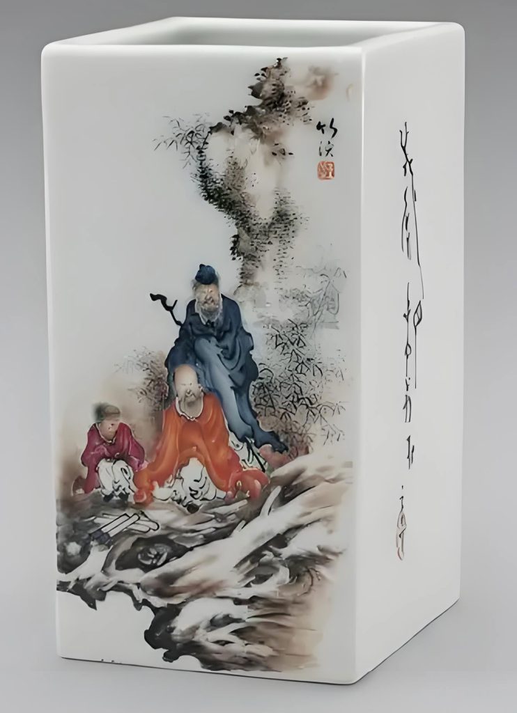 王步的创作始终暗含对”瓷”作为艺术载体的自觉。其瓷板作品(图1、图4)突破了瓶罐的曲面限制,以平面空间承载完整的文人画构图;而笔筒(图3)则利用四方器型的转折,使画面在不同视角下呈现连续的叙事性。这种”依器造境”的意识,既区别于纸本绘画的无边界性,又摆脱了传统瓷绘”依附器型”的从属地位——瓷不再是画的载体,而是与画共生的艺术本体。
